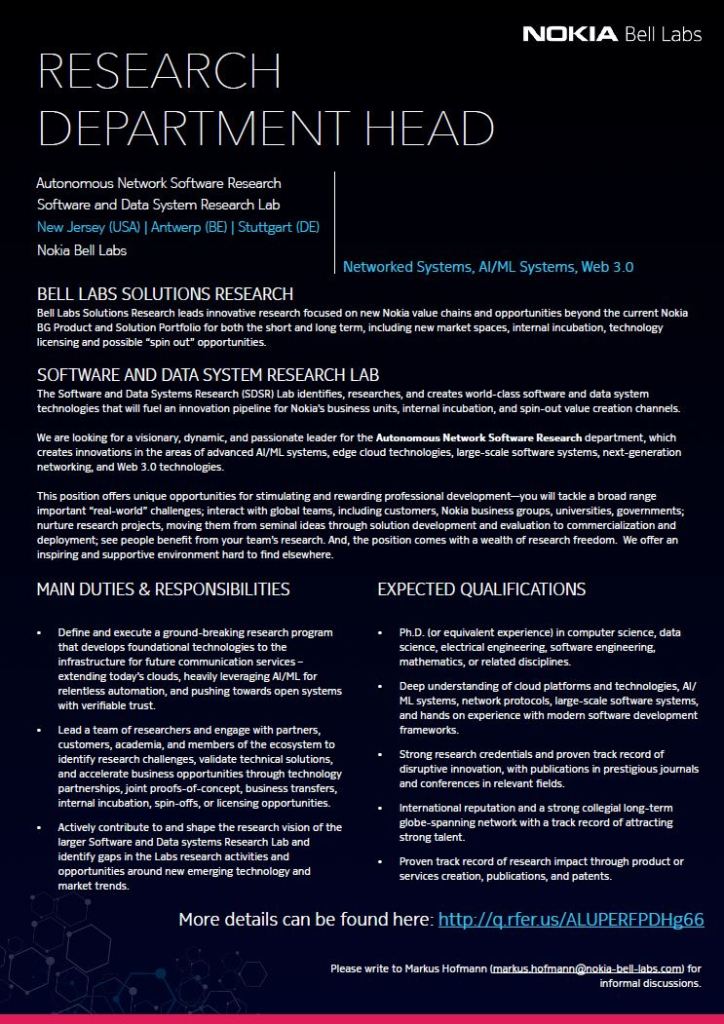 Interested in an exciting challenge, in taking the next step in your career, in becoming the new Head of our Autonomous Network Software Research Department? Let’s chat! Please drop me a note via markus.hofmann@nokia-bell-labs.com, or apply directly on the Nokia job site.